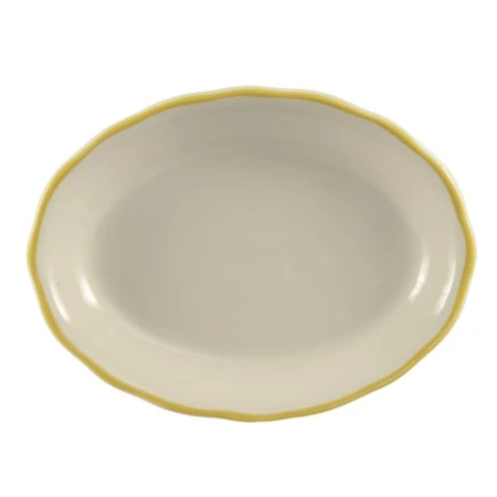 Seville Platter11-5/8″ L x 8-1/2″ W x 1-1/2″ HOvalScallop edgeDishwasher and oven safeStoneware (ceramic)Gold Band/American White