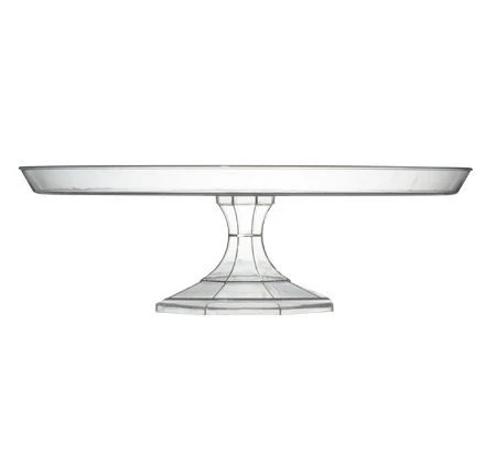 Thanks to its sturdy base, this disposable cake stand sits flat on any surface for stability while its clear color can match any decor. Perfect for fast-paced food service venues, this polystyrene cake stand is disposable for fast and easy cleanup,