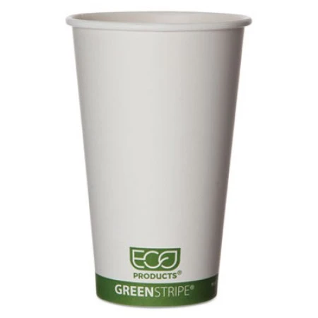 GreenStripe Renewable & Compostable Hot Cups – 16 oz., 50/PK, 20 PK/CT. Sip hot coffee or tea in durable PLA-lined paper cups. Great for hot drinks. White cups with green stripe blend into any surroundings without distracting from delicious beverages. Cup Type: Hot; Capacity (Volume): 16 oz; Material(s): Paper; Color(s): White/Green.