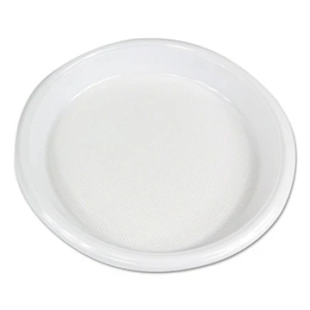 Hi-Impact Plastic Dinnerware, Plate, 10″ Diameter, White, 500/Carton. Convenient and practical plastic dinnerware is durable, non-absorbent, leak-proof and soak-proof. It’s designed with deep proportions to avoid spillage so your dinner stays safe.