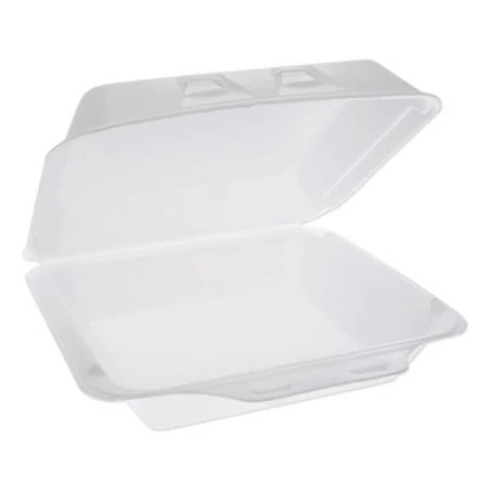 Perfect for takeout meals, the Pactiv SmartLock White Foam Hinged Lid Container, 9″ x 9″ x 3-1/4″ is a practical and affordable packaging solution. The durable foam construction provides strength and insulation, maintaining food at optimal temperatures for prolonged periods. Whether you are serving hot meals or chilled salads, this disposable container ensure that your food remains at its best.