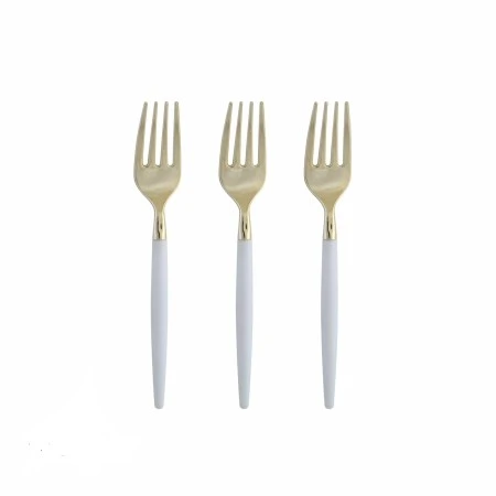 An affordable luxury, the TigerChef Clear and Gold Two Tone Plastic Mini Forks will help transform your intimate events into a magnificent and memorable experience. Use these disposable mini forks when serving appetizers or desserts. Featuring a glint of gold with a clear, round handle, these disposable mini forks add an elegant touch at a low cost to you. Made from premium plastic, these BPA free forks will resist bending, folding, or breaking under pressure. A hassle-free alternative to using real flatware, these plastic mini forks are easily disposable. Add these premium plastic two tone mini forks to your buffet area for quick and easy access during catered events.