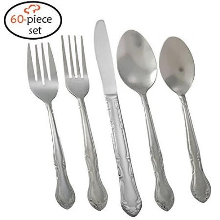 Each flatware set includes 12 salad forks, dinner forks, dinner knives, dinner spoons and teaspoons and is constructed of heavy weight 18/0 stainless steel. Dishwasher safe and corrosion resistant, this is exceptionally well-priced flatware set will last for years.