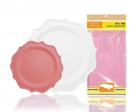 Made of heavy duty plastic, these plates will not sag, break or bend during meal service and thanks to their unique scalloped rim design, they will create an instant decorative touch to your tabletop settings. In addition, because they are made of durable plastic, they can be reused if needed by simply handwashing after each course. The pink tablecloth, included, is made of heavy dury plastic and will not tear or rip and it matches perfectly with the pink plates, creating a professional look to your party table.