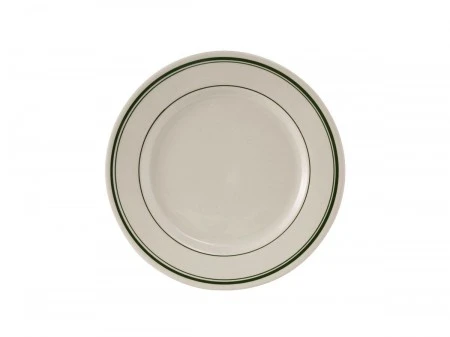 When serving entrees, sides, small salads, and desserts, use the Tuxton TGB-007 Green Bay 7-1/8″ China Plate. American white in color, this wide rimmed plate features green bands and a rolled edge. It is fully vitrified and lead free, and is microwave, dishwasher and oven safe. This plate comes with a lifetime edge chip limited warranty.