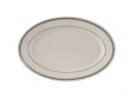 The American white Tuxton TGB-013 Green Bay 11-5/8″ x 8″ Oval Platter has emerald bands on the rolled edge, and a wide attravtive rim. It is very durable, and comes with a lifetime edge chip limited warranty. The platter is microwave, dishwasher and oven safe.